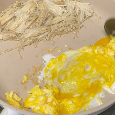 3. 볶은 팽이버섯을 한쪽으로 보내고 남은쪽에 계란을 스크램블합니다.