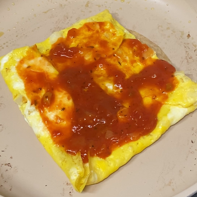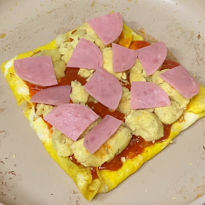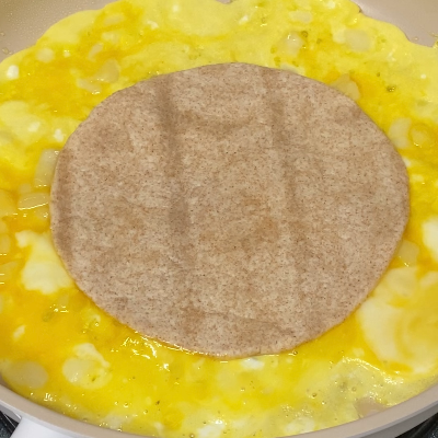 5. 계란이 살짝 익으면 또띠아를 올려주고
